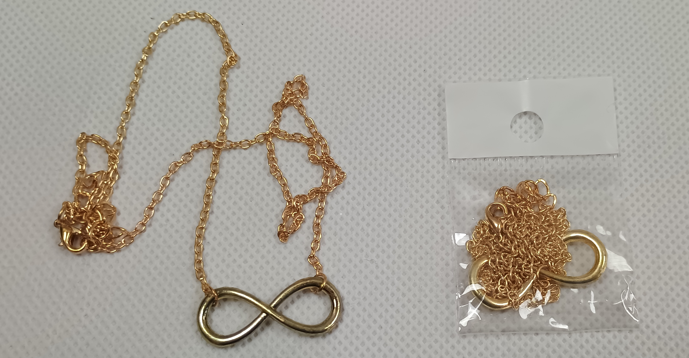 Náhrdelník/retiazka zlatej farby je dlhá 490 mm a má integrovaný prívesok zlatej farby v tvare nekonečno. Prívesok má rozmery 31x13 mm. Náhrdelník je balený v malom priehľadom plastovom obale bez akéhokoľvek označenia identifikačnými údajmi.