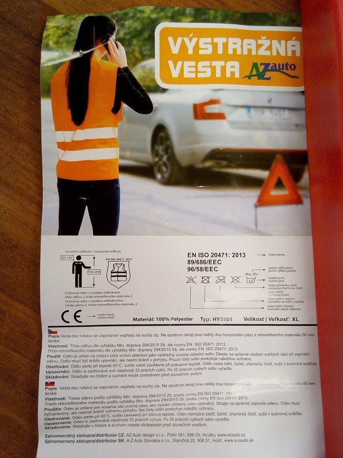 Ide o výstražnú vestu, ktorá bola súčasťou povinnej výbavy motorového vozidla s nápisom MOTOR – CAR Bratislava a logom FIAT. Súčasťou uvedenej povinnej výbavy bol aj výstražný trojuholník, zverejnený v zozname nebezpečných výrobkov zistených SOI pod odkazom https://www.soi.sk/sk/Nebezpecne-vyrobky/Narodny-trh-SR/vystrazny-trojuholnik-s-homologizacnym-cislom-e11-27r-033977.soi?ind